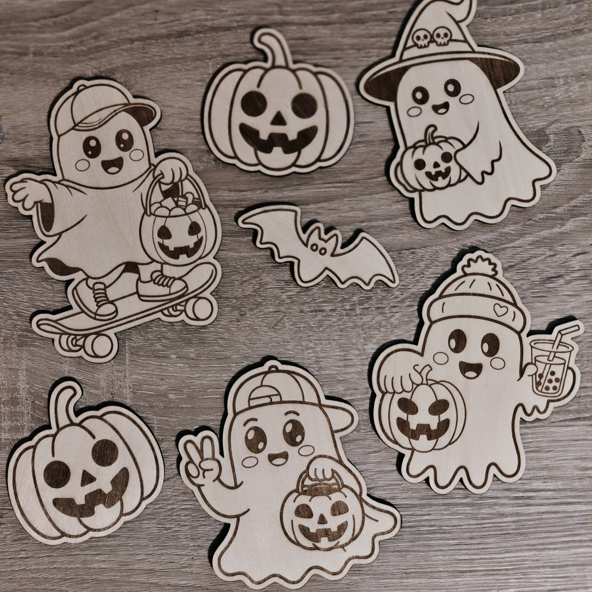 In dit pakket zitten 4 schattige spookjes, 2 pompoenen en een vleermuis.
