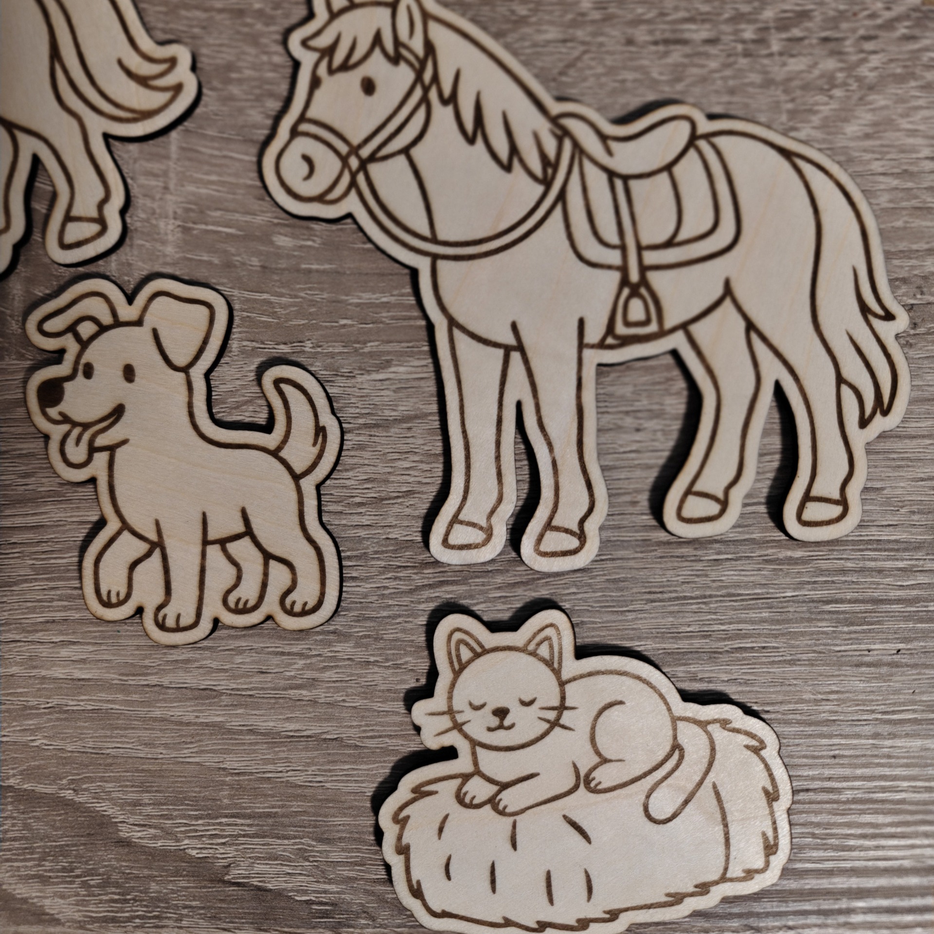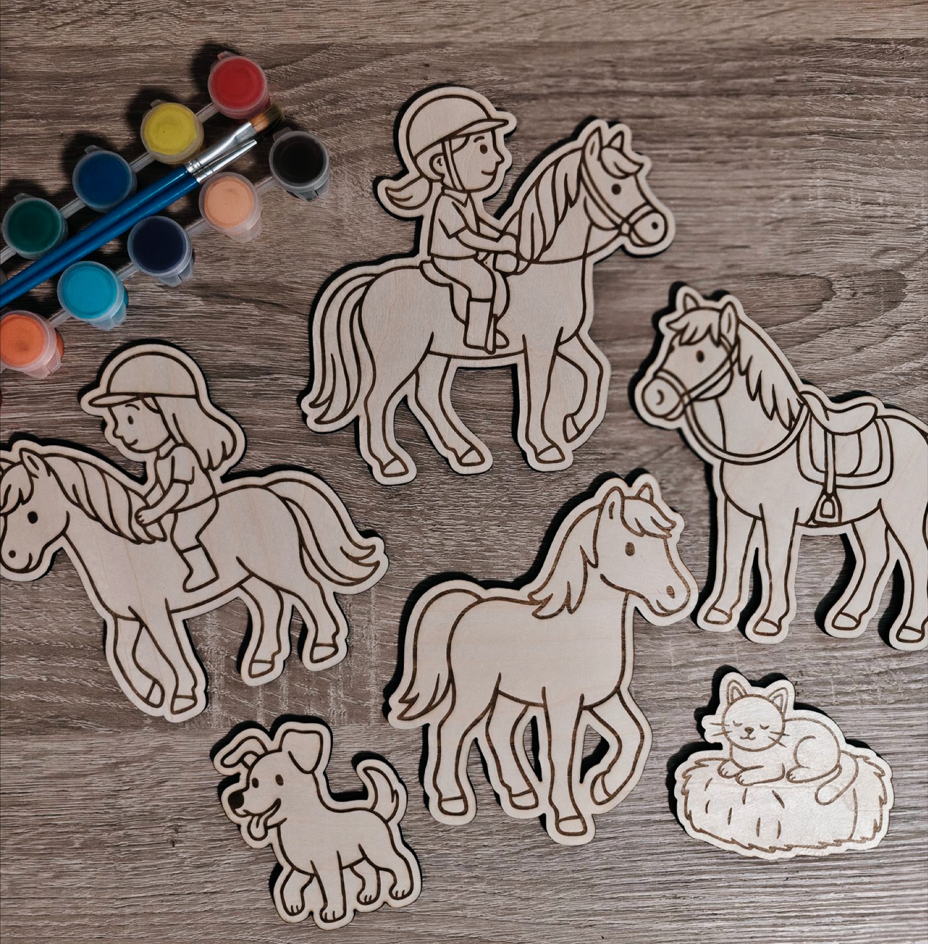 Met deze verfset voor paardenliefhebbers is het gegarandeerd feest! De houten figuren zijn laser-gesneden uit duurzaam hout en voorzien van een lijntekening, waardoor ze ideaal zijn om zelf te beschilderen.